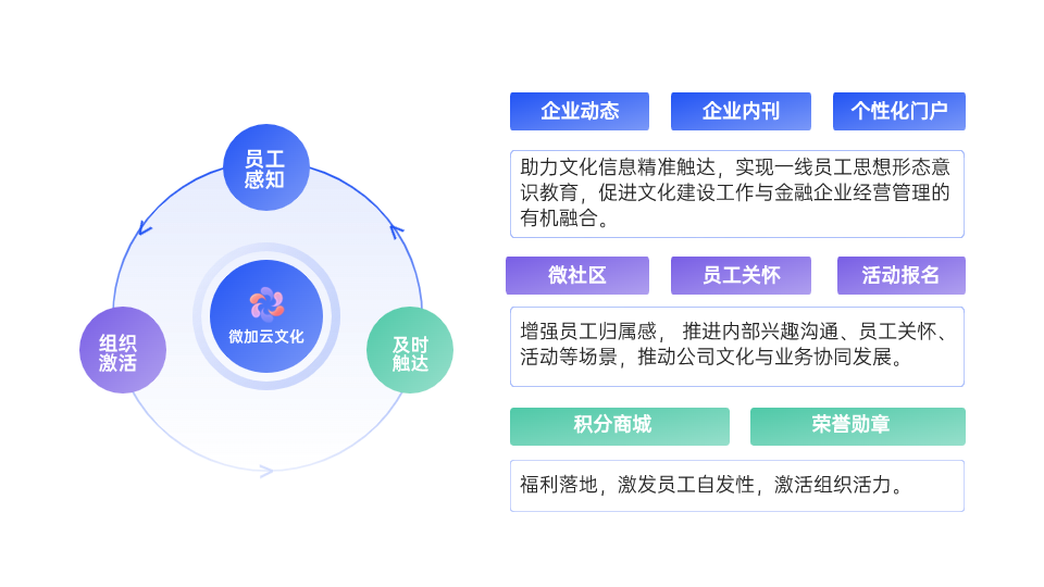 ▪ 搭建线上触达展示平台,融合先进管理理念,多元化进行方针、政策的内宣 ▪ 打造多元文化阵地,利用社区、动态、相册等,加强文化氛围建设 ▪ 借助员工关怀、活动组织、荣誉勋章等,提升员工的归属感和对文化的认同感