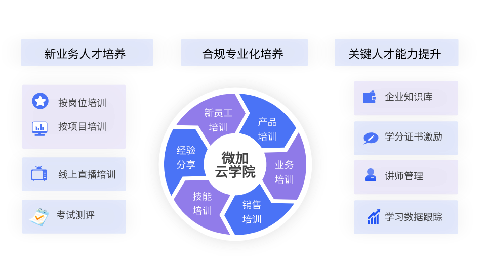 ▪ 优化新员工培训重复性工作,自动化开班学习,学习数据状态随时可查 ▪ 学考同步,实施线上业务知识培训测评。打造知识库内容,沉淀宝贵资料内容,可随时回顾 ▪ 线上培训学习+线下培训报名,闭环学习路径