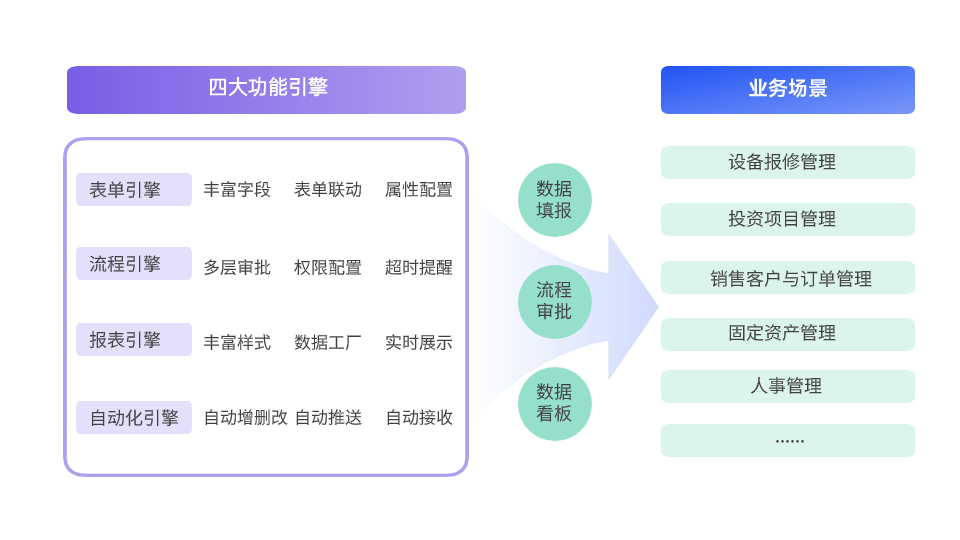 ▪ 汇集多系统审批流程,实现一体化审批管理 ▪ 搭建设备报修、项目管理等应用,标准化、规范化报修业务流程 ▪ 生成追踪报表,实时查看处理进度并统计