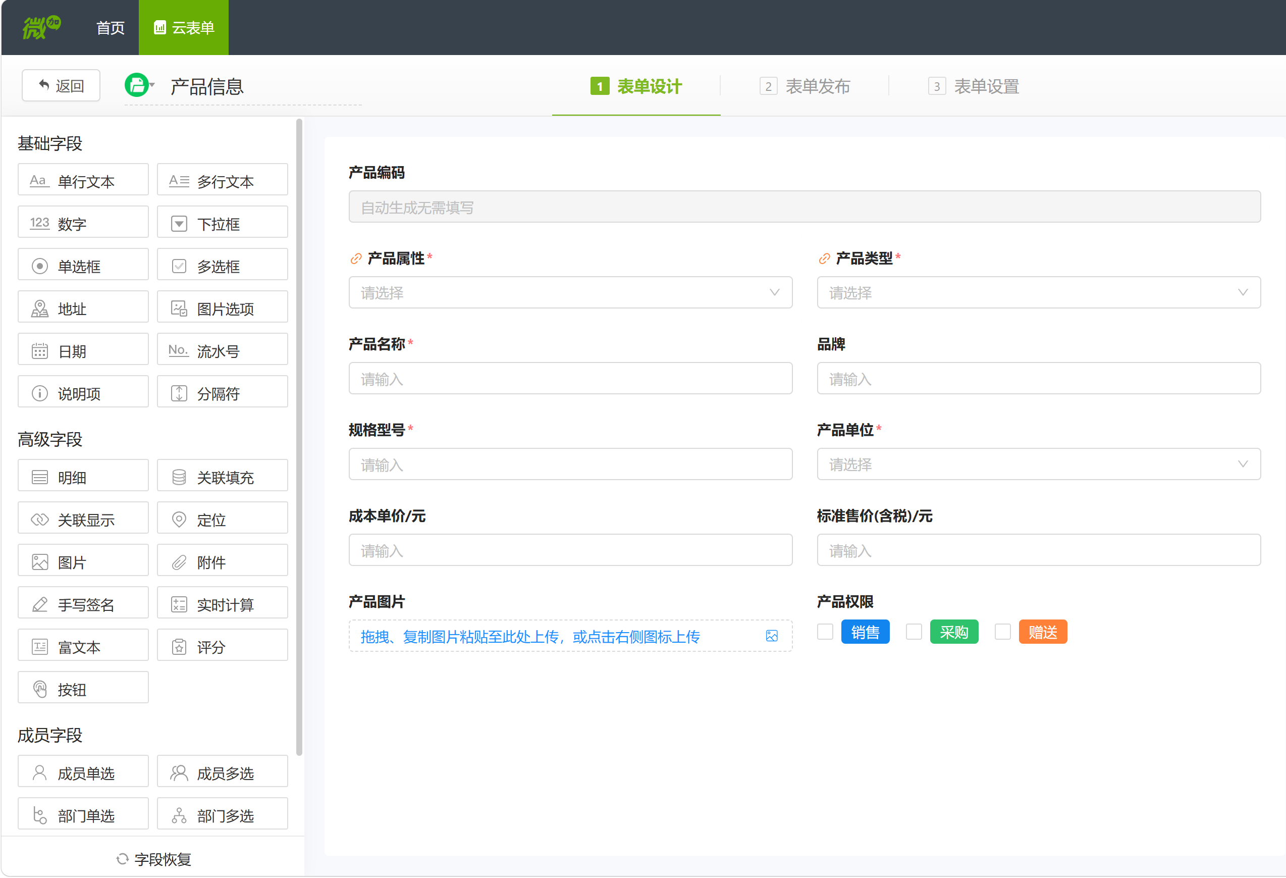 产品信息管理是整个系统的核心数据表,存储商品的基本档案,包括商品名称、规格型号、单位、条码、图片、采购价、销售价等信息。在微加云表单中,可以通过单行文本、数字、图片、下拉框等多种字段控件灵活搭建产品信息表,还支持数据联动和关联显示等高级功能。
