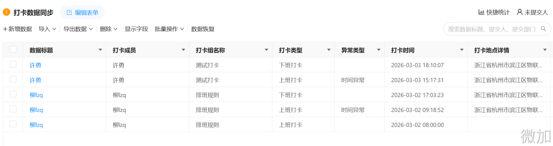 可以方便快捷地将企业微信中的打卡数据同步到表单中,让管理员可以使用这些数据计算员工的出勤率和工资等数据。