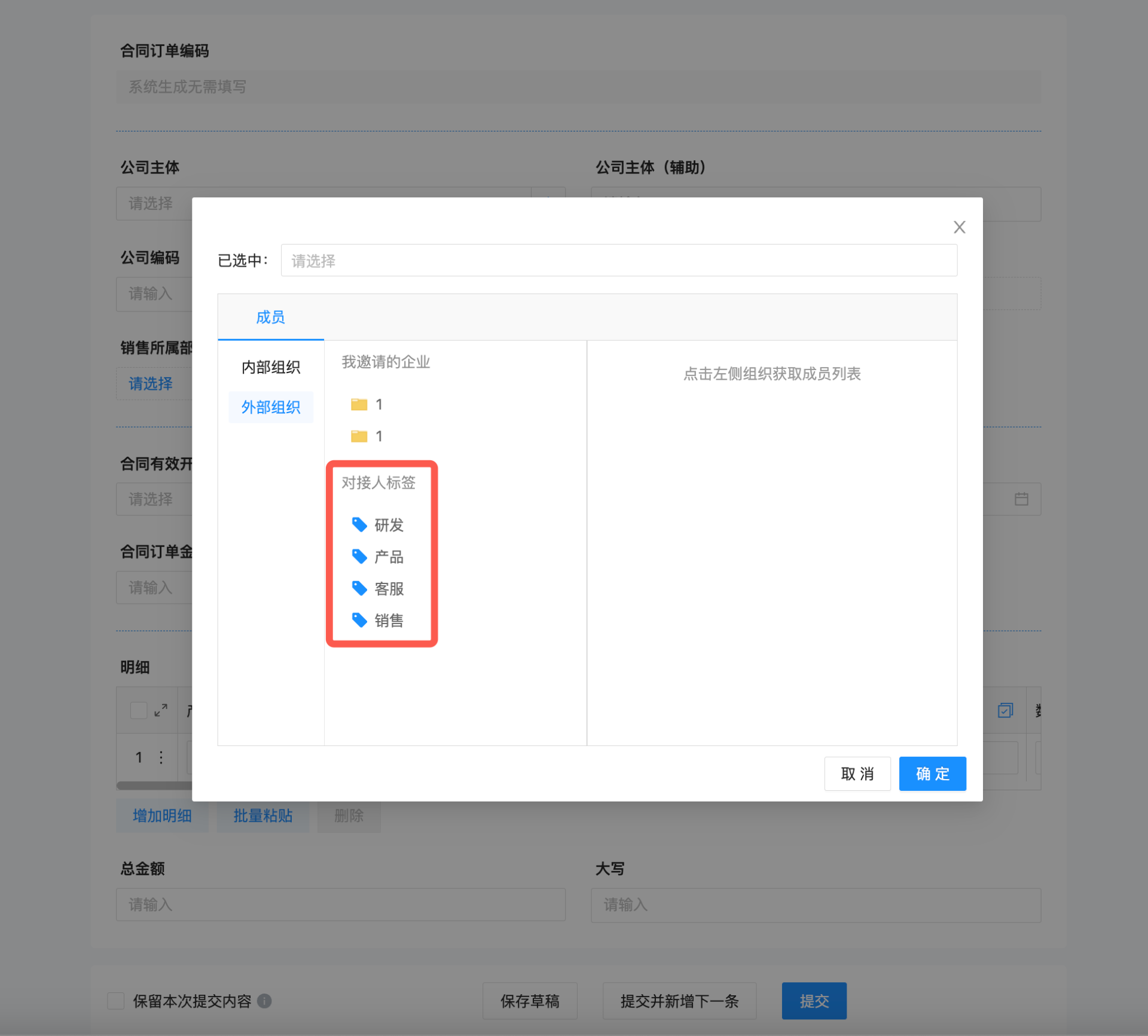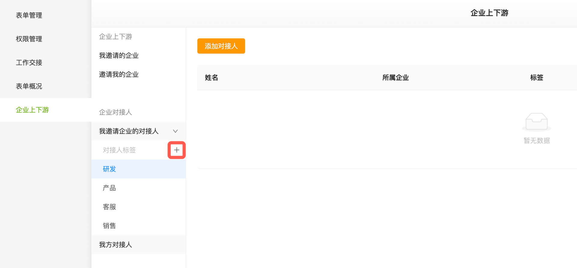 注意:需要先在企业上下游中建立外部组织的对接人标签。