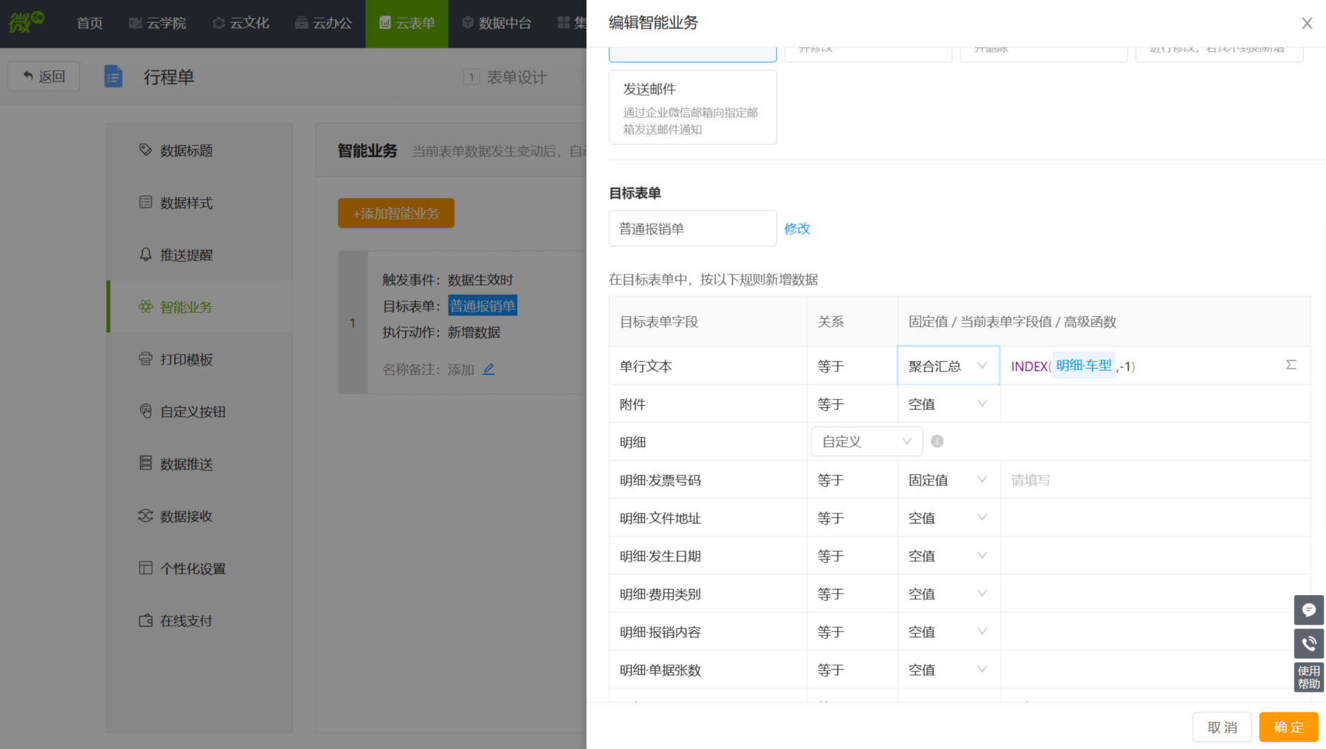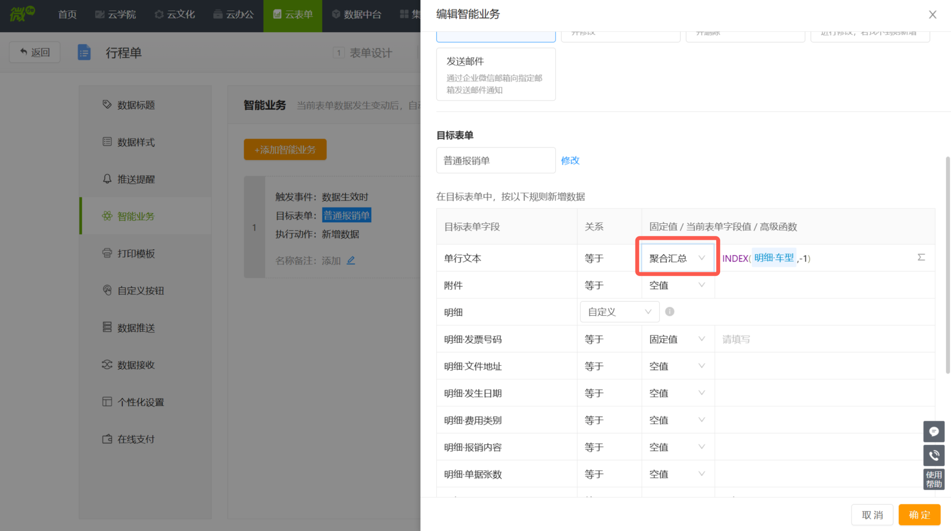 在设置时,所有明细字段均需要用聚合汇总函数包裹才能添加。例如:INDEX(明细·车型, -1) 表示获取明细最后一行车型字段的值。