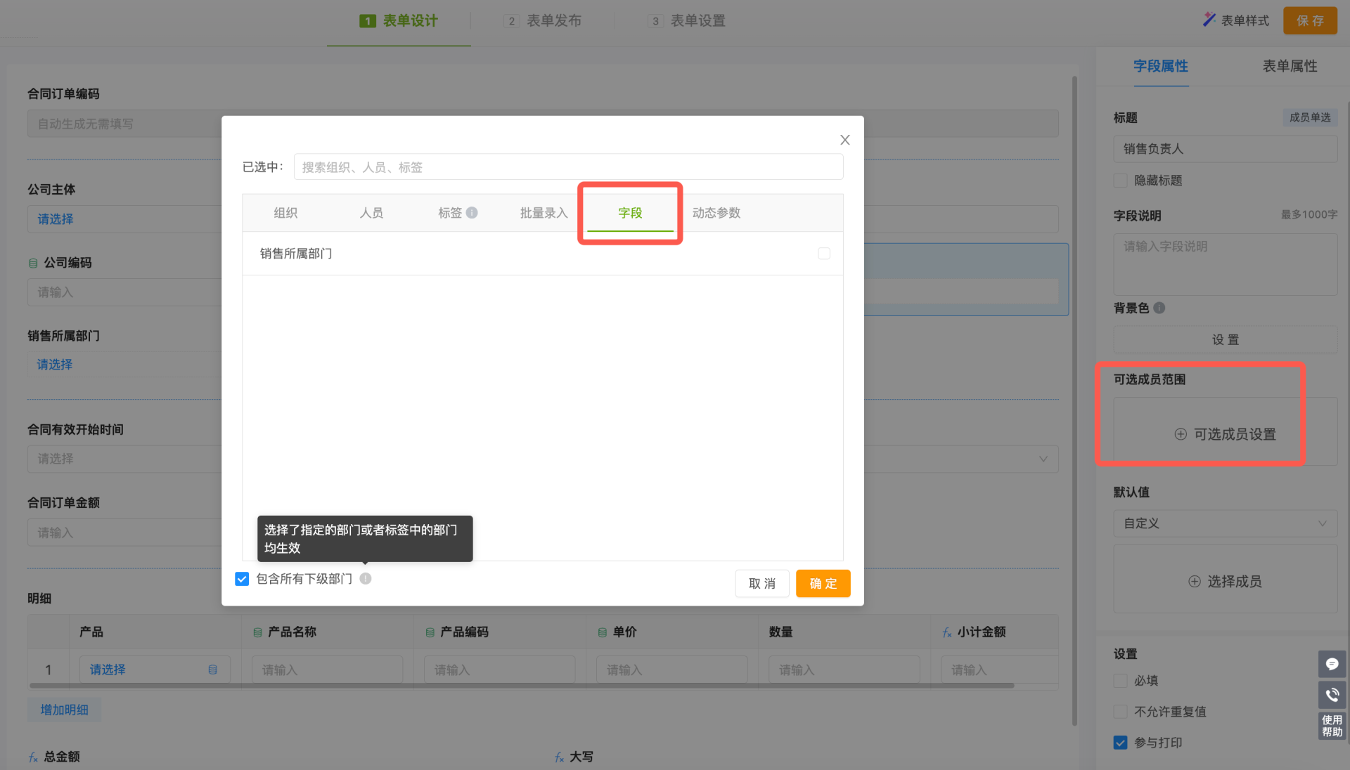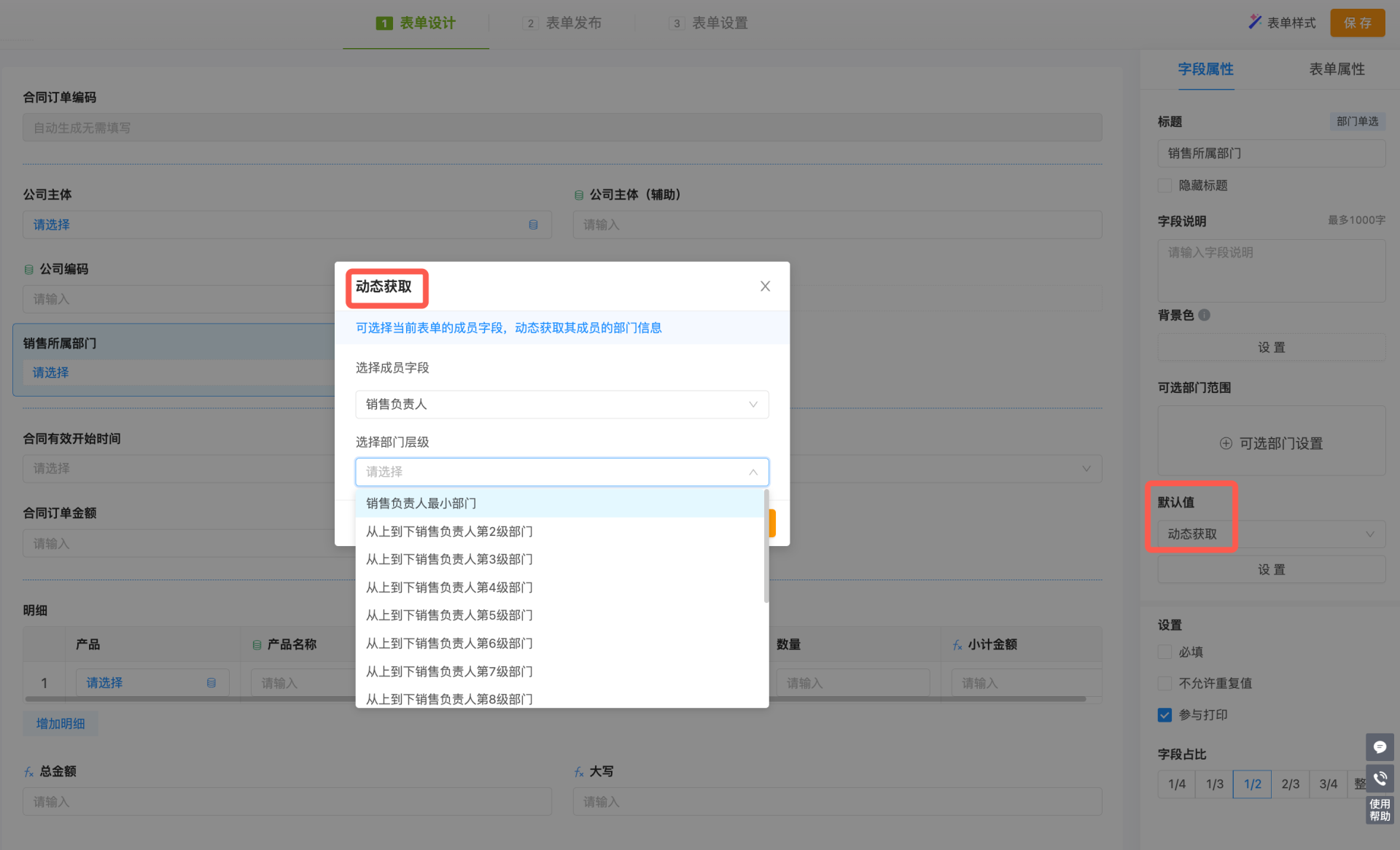 默认值设置【动态获取】,可选择当前表单的成员字段的:最小部门或从上到下的第几级部门。