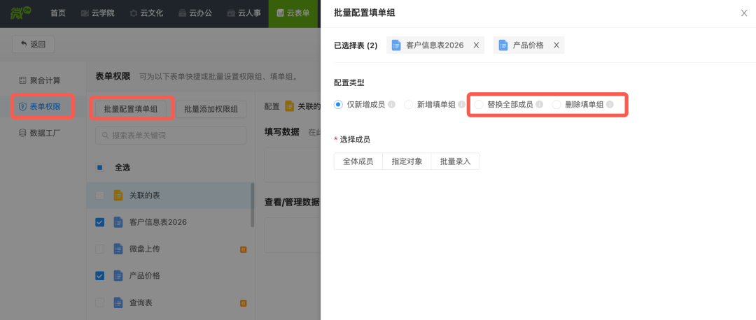 为表单批量设置填单组,新增:替换原有填单组的全部成员、删除填单组。