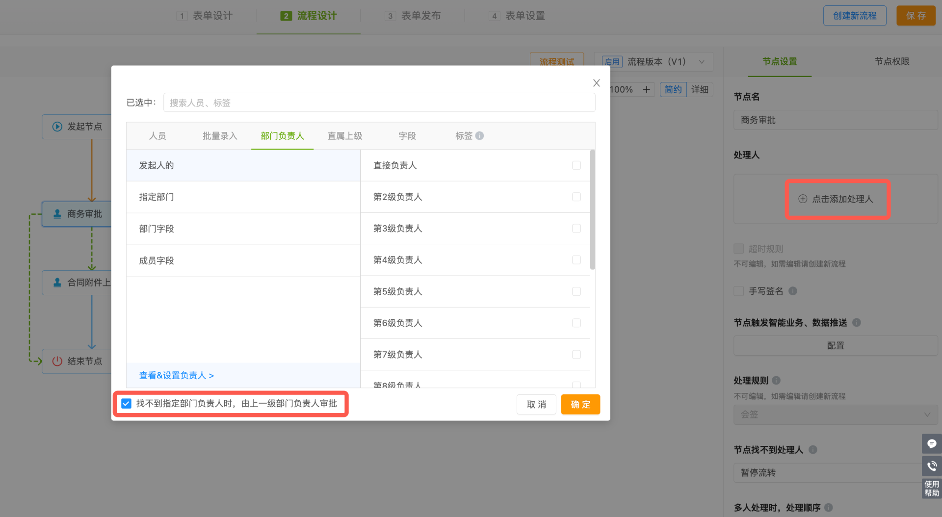 流程设计:流程审批找不到指定部门负责人时,由上一级部门负责人审批