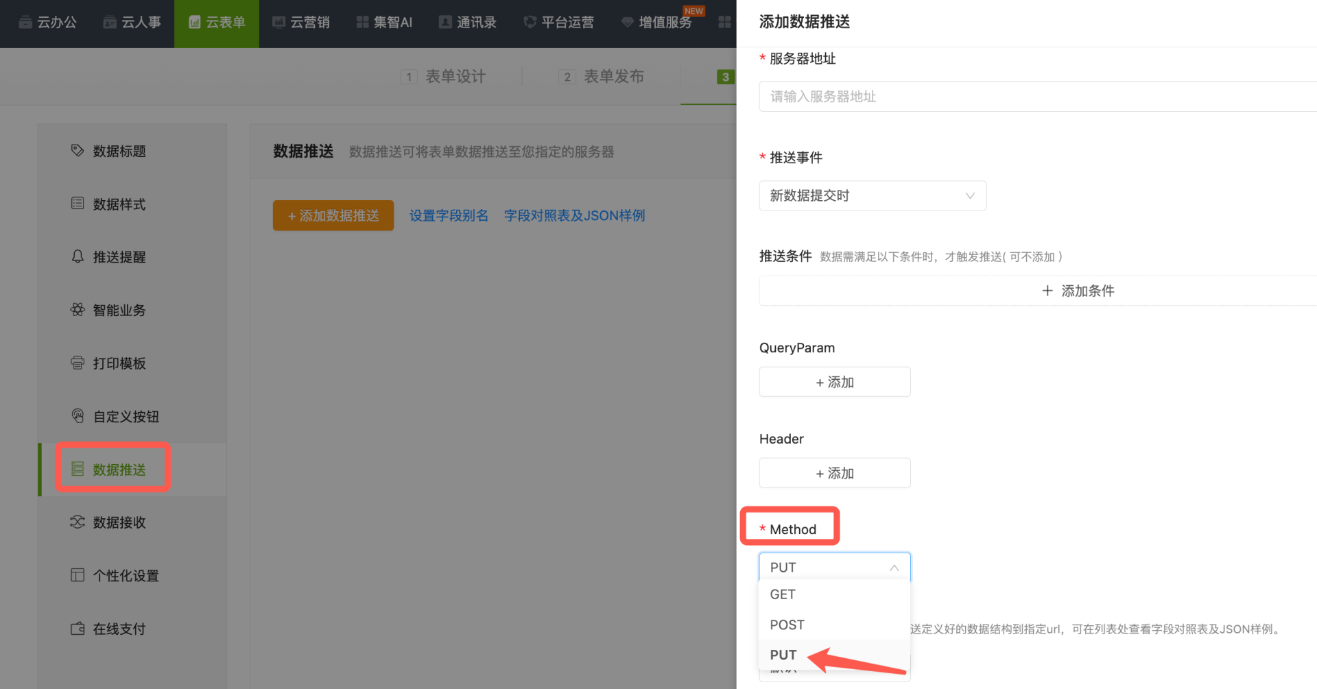 数据连接、数据推送的请求类型新增PUT(更新事件)。
