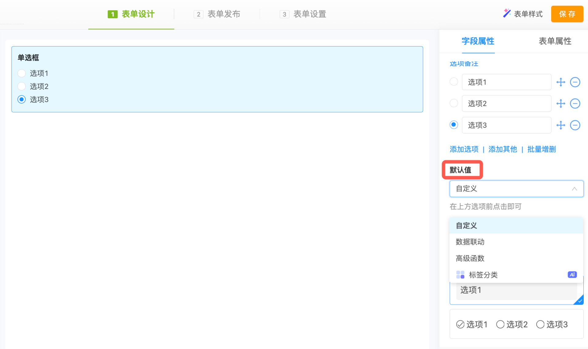 单选框新增默认值配置:自定义、数据联动、高级函数、AI填充。